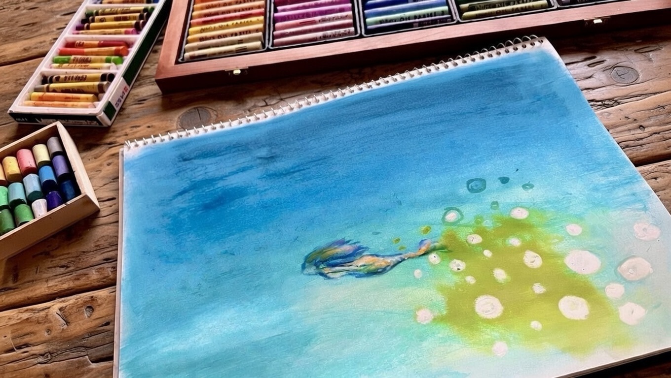ゆるゆると、セルフでのアートワークをしてて、その中のひとつ。水の音をきいていると浮かびあがったイメージがこれでした。なんかぽこぽこーって小さな泡がみえて、黄色で。海の中は下にいくほど明るくて。そしたら人魚のような存在もでてきた。